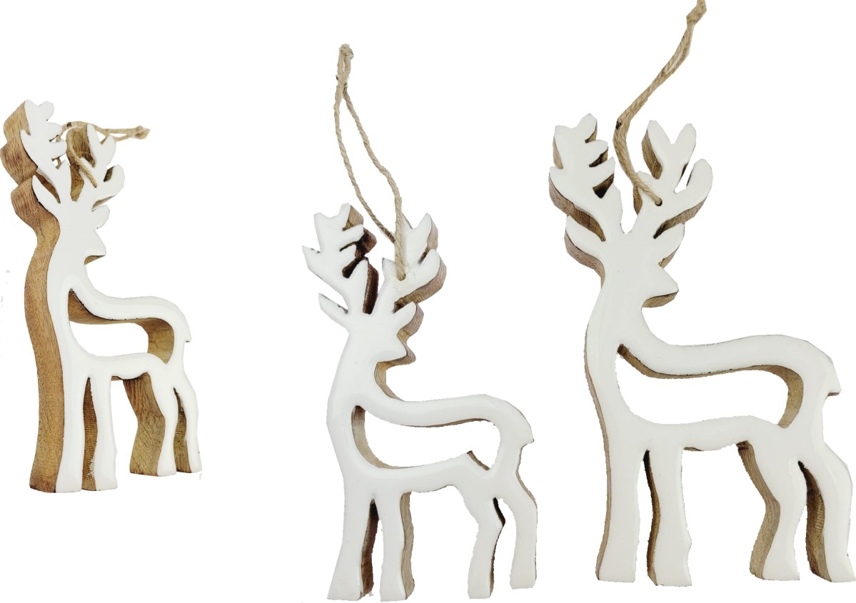 ... zum Aufhaengen COD: A.079.76 Mango-Holz emaillierte weiße Hirsche 2 sortiert. cm 13/15 H Verpackung.... 12 Stücke.