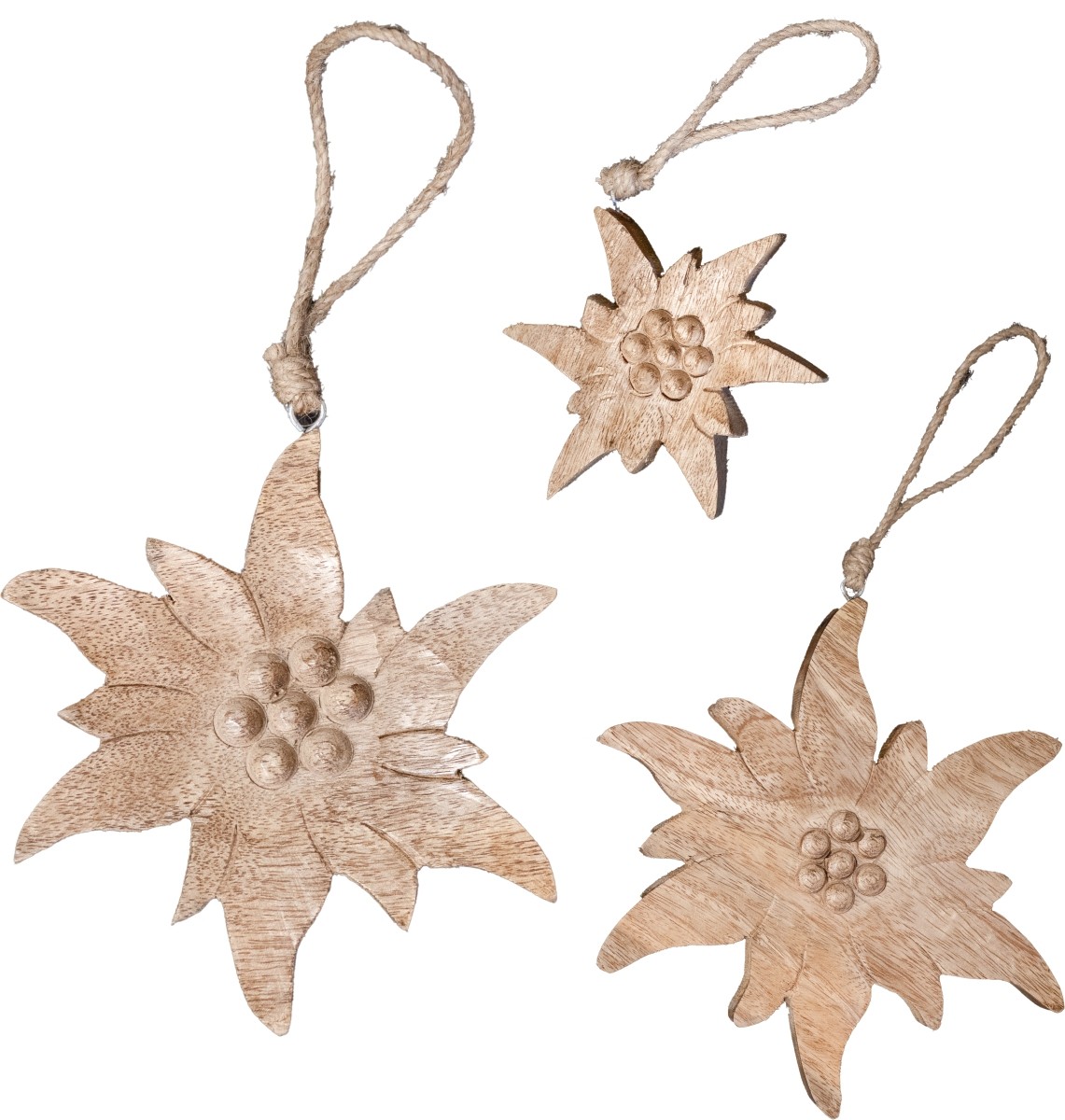 ... da appendere COD: A.090.10 Legno mango - stella alpina incisa 3 misure cm ø 10/16/20 Confezione da 12 pezzi.