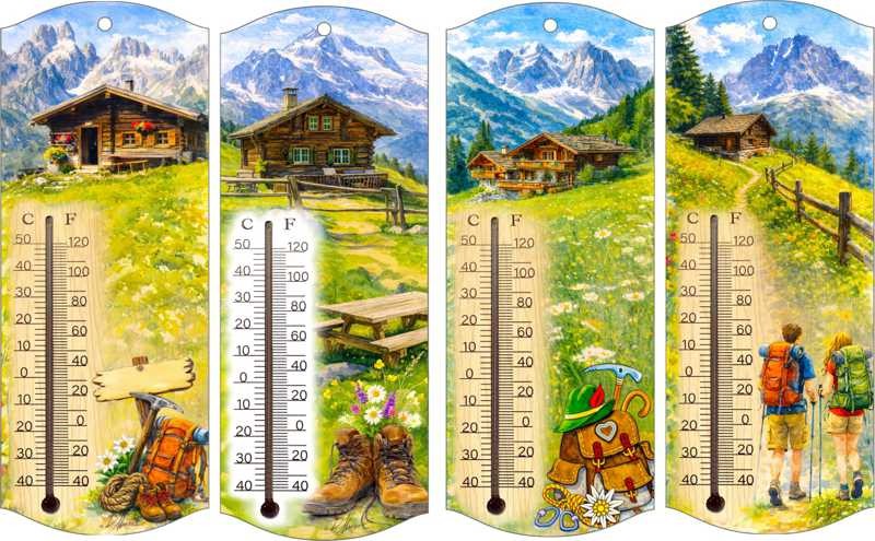 Termometri COD: A.300.30 Termometro disegno DMF cm 10x27 H - Estate in montagna Confezione da 12 pezzi.